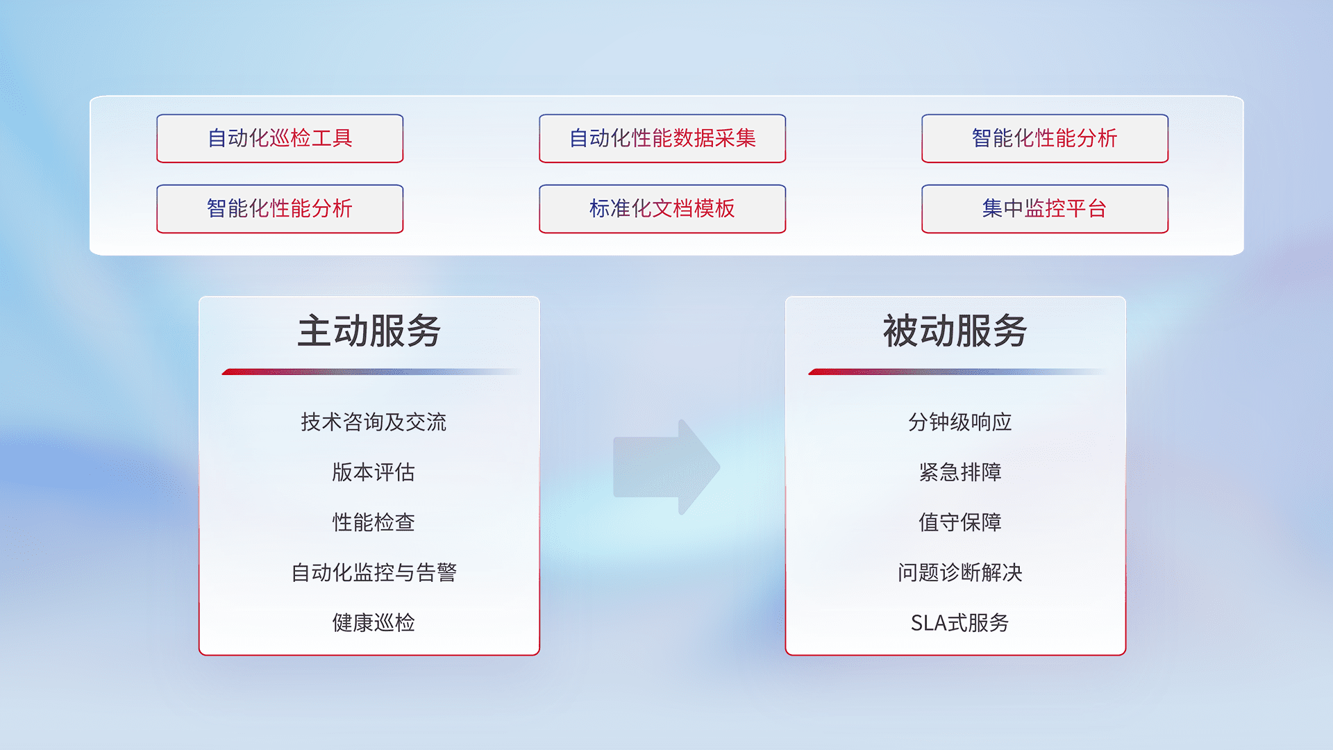 智能化工具和标准化文档,,保障服务质量,,,提供主动服务(包含技术咨询、、、版本评估、、、性能检查、、、自动化监控与告警、、健康巡检)和被动服务包含(分钟级响应、、紧急排障、、值守保障、、、问题诊断解决、、、SLA服务)。。