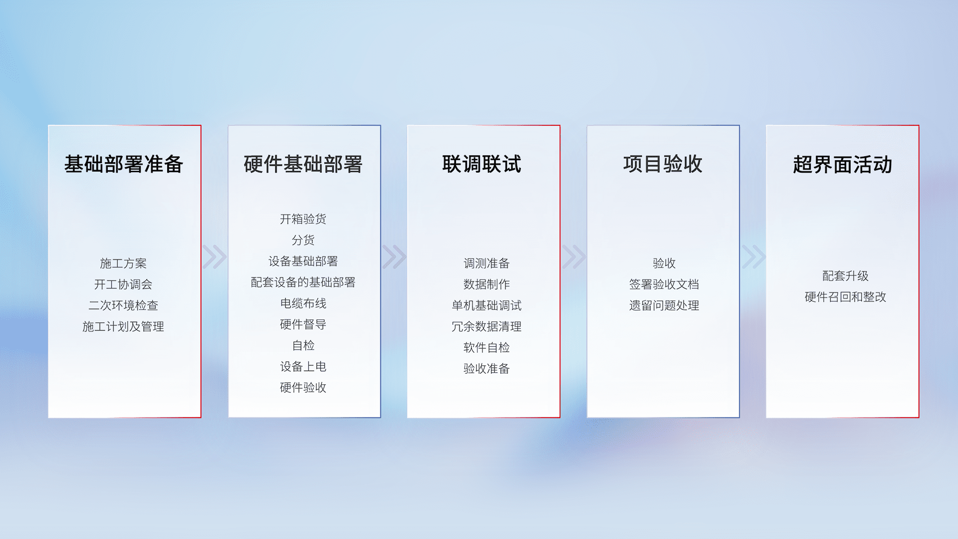 从基础部署准备、、、、硬件基础部署、、、联调联试、、项目验收、、、越界面活动的全过程可追溯,,,保证施工质量和进度。。。。